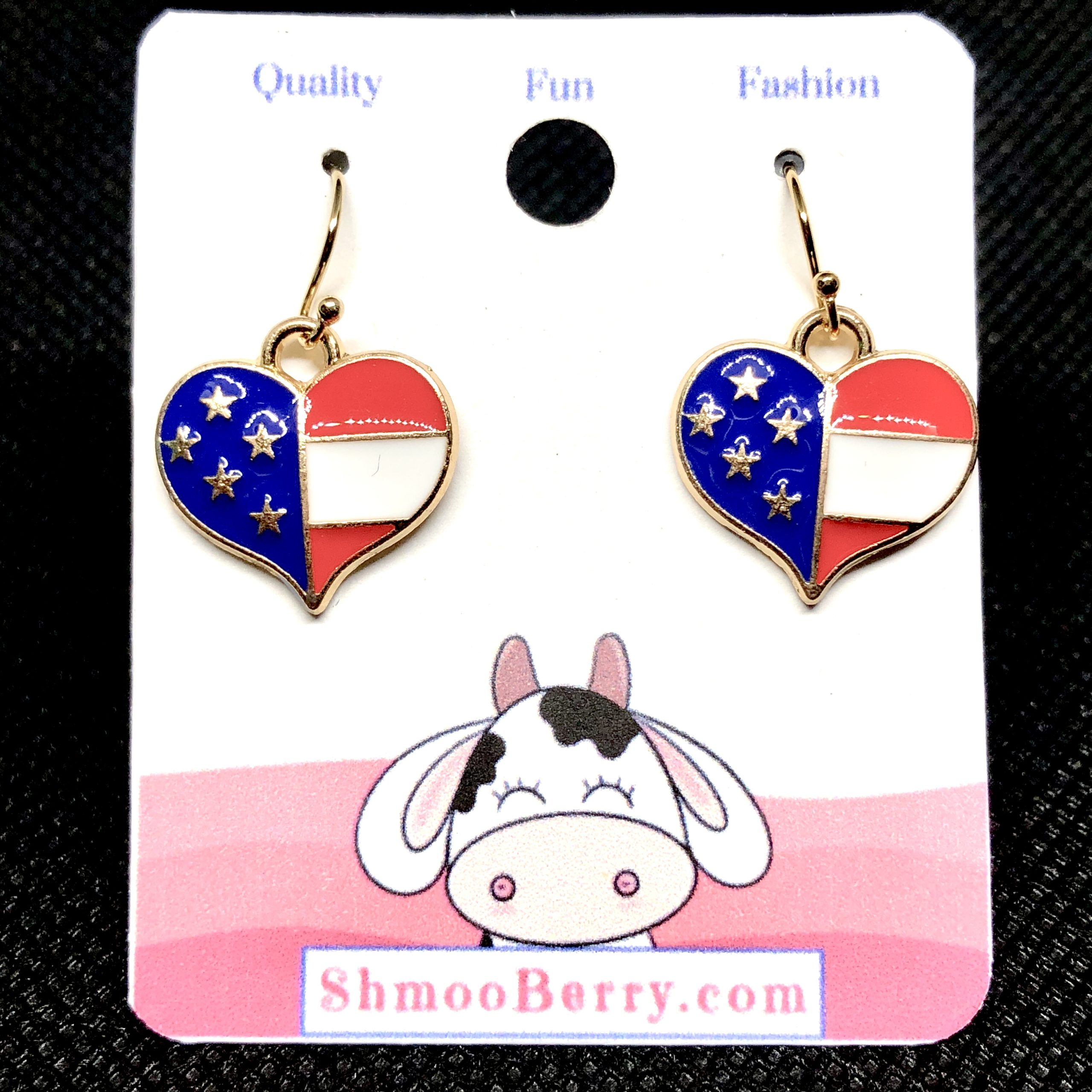 Made with 14k-gold filled earring wires and gold plated enamel U.S. Flag heart dangles.